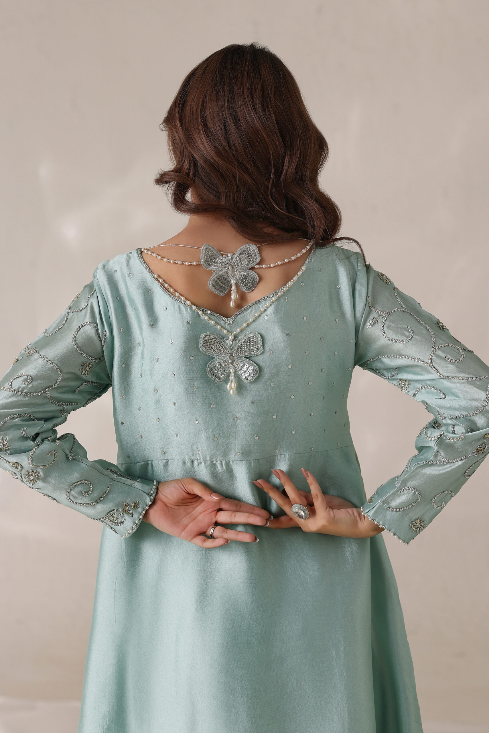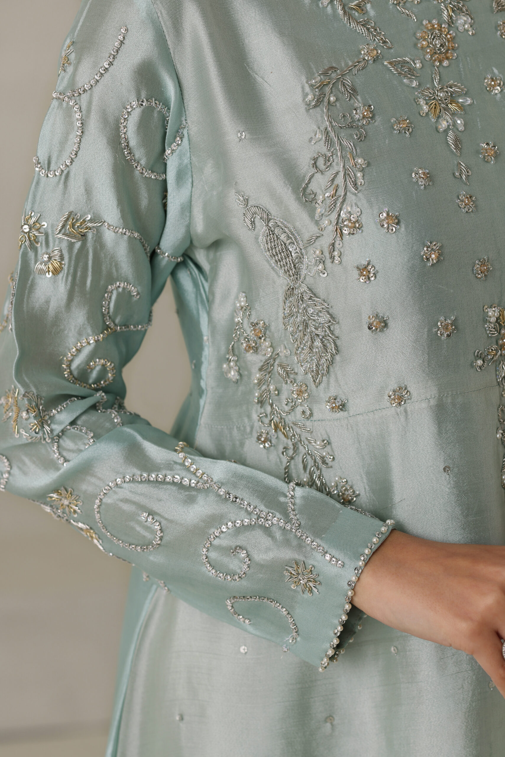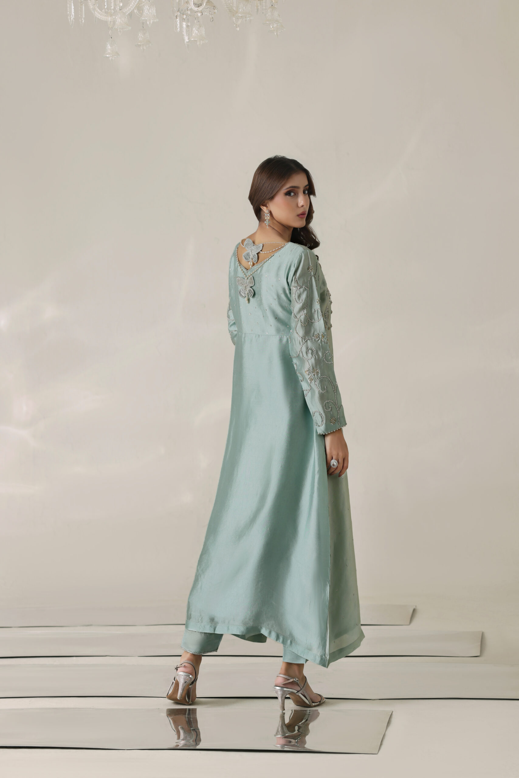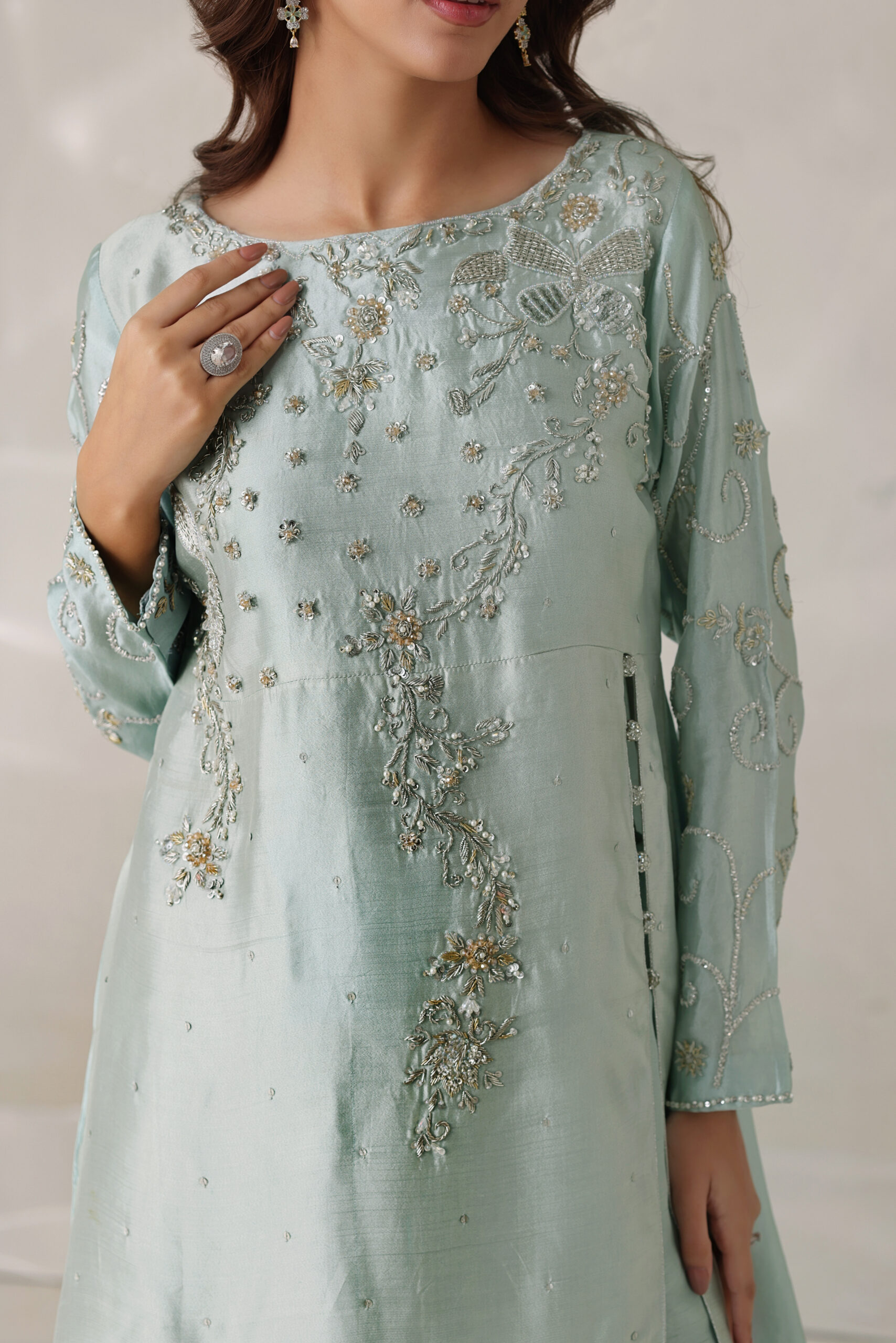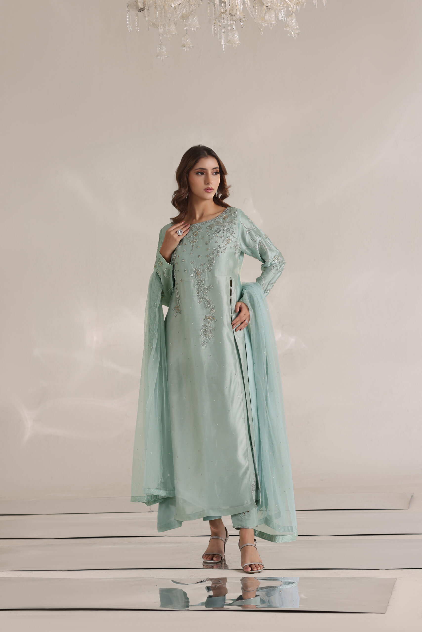 This look brings a soft, luminous take to festive elegance in a refreshing mint green hue. Crafted from premium seesha silk, the shirt features a graceful silhouette that captures a timeless charm. The ensemble is paired with smooth Korean silk trousers to maintain a refined and cohesive aesthetic. A delicate net dupatta drapes beautifully, adding a layer of airy sophistication for a quietly luxurious finish.
